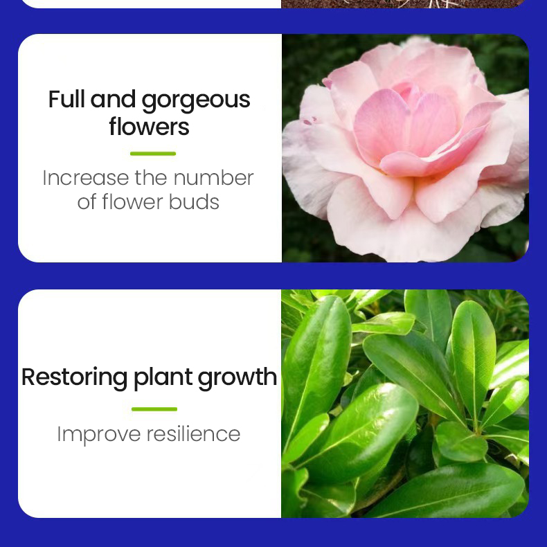 If you have any problems such as soil compaction and whitening, slow and stagnant plant growth, yellowing, blackening, drying and curling leaves, root rot, no flowering and no fruiting, etc., please purchase our soil activator, which will take effect in as fast as 3 days.Now is the best time for plant growth, and using our soil activator at this time will exceed your expectations, so don't miss it!